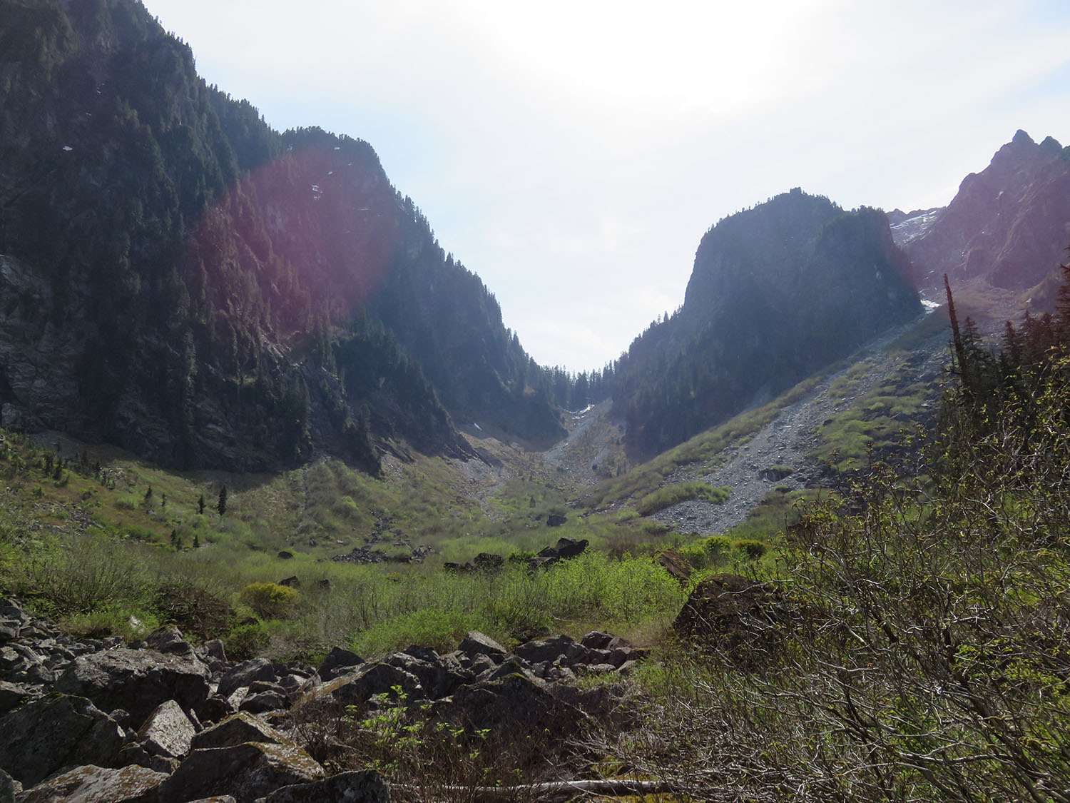 You have to go up the boulderfield now. There are markers, but not always easily seen. Just head straight up the boulderfield towards the Crown Goat col. Once in the col, there will be a sign telling you to turn left to get to the Grouse gondola (going right would take you to Crown). You will get to a few steep sections with chains to help you up.
